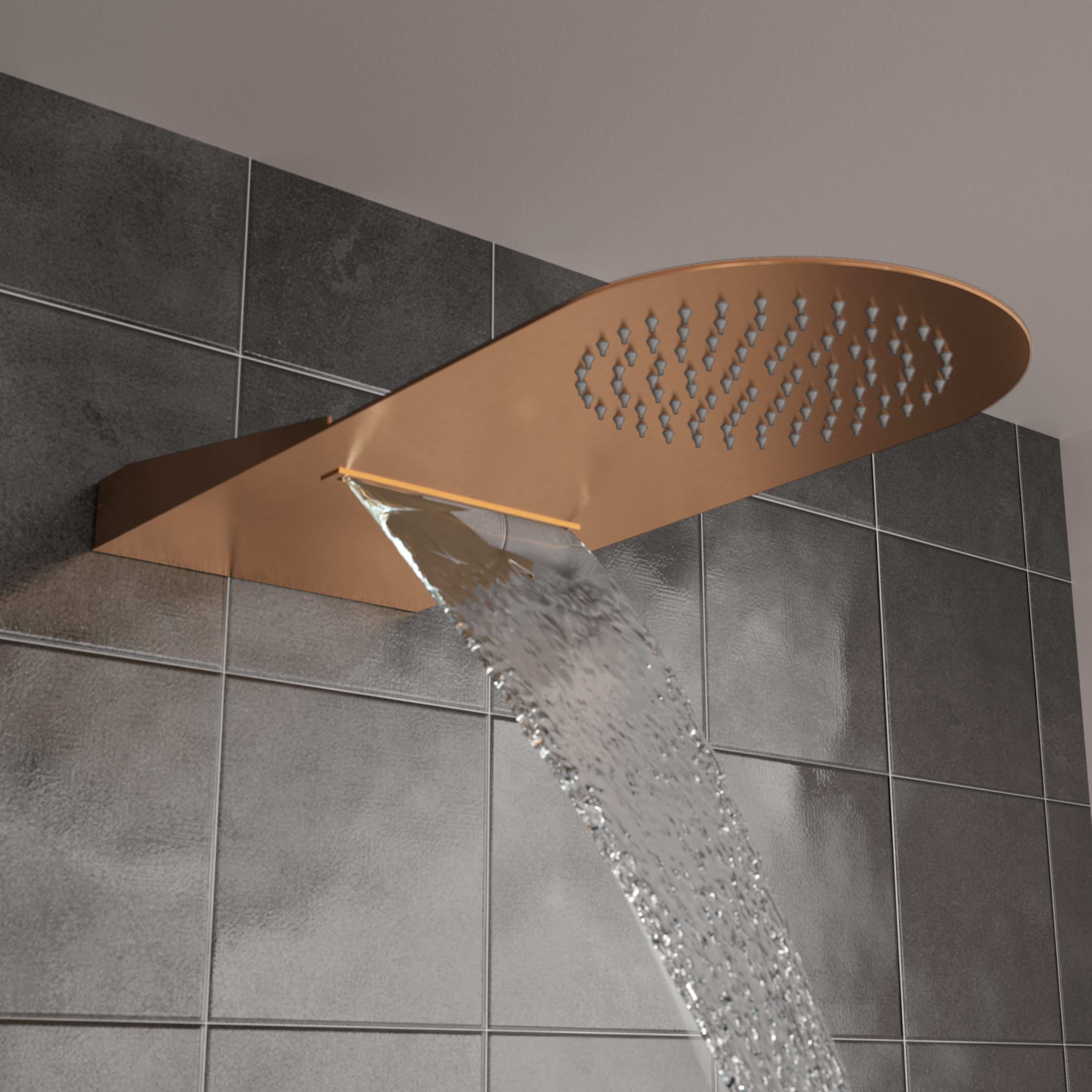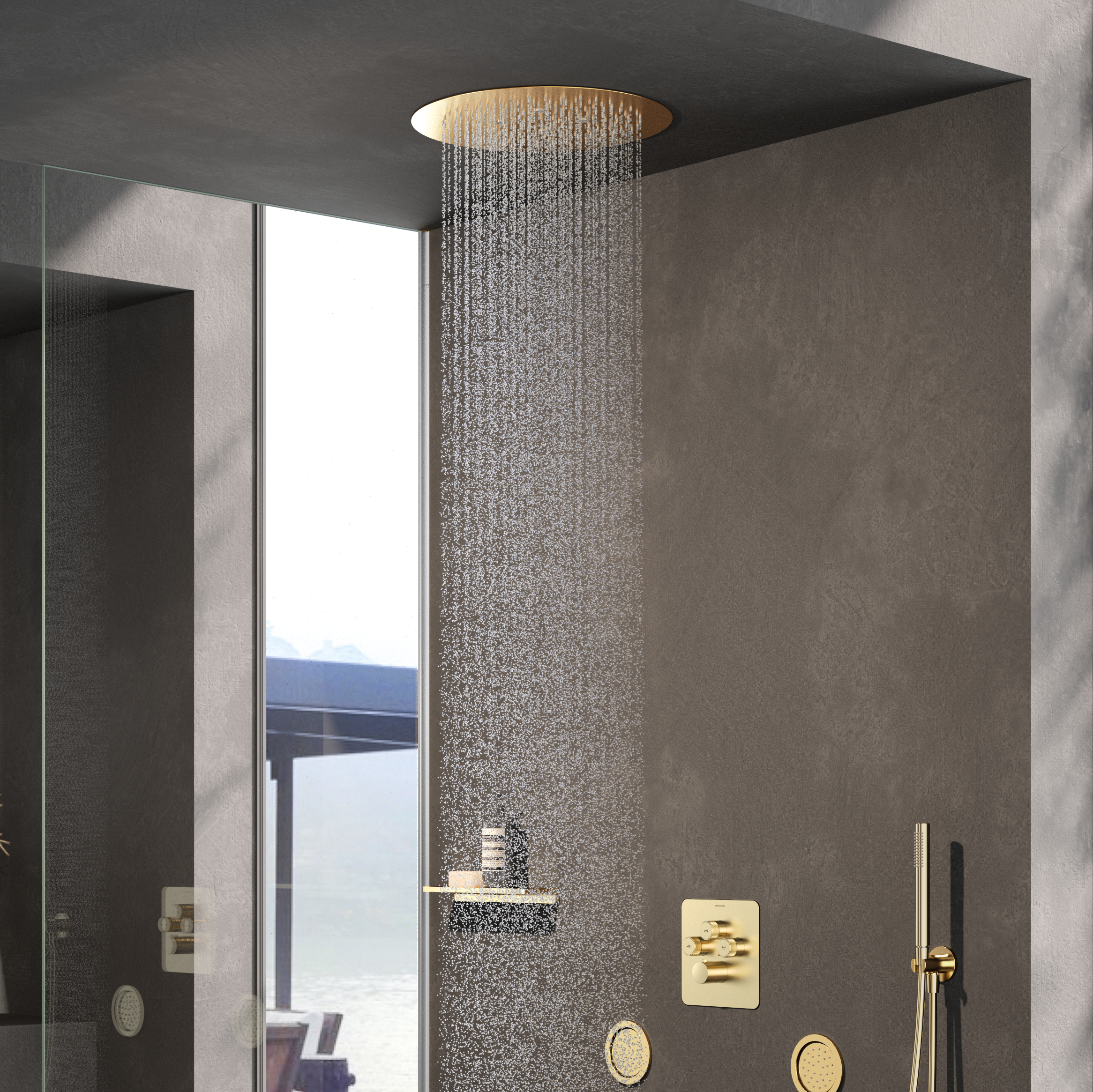 Elegancia sofisticada en su máxima expresión con los rociadores empotrados redondos con cascada de Ø450mm. La característica distintiva de estos rociadores es la opción con cascada, que proporciona una caída de agua amplia y relajante, simulando la experiencia de una cascada natural.