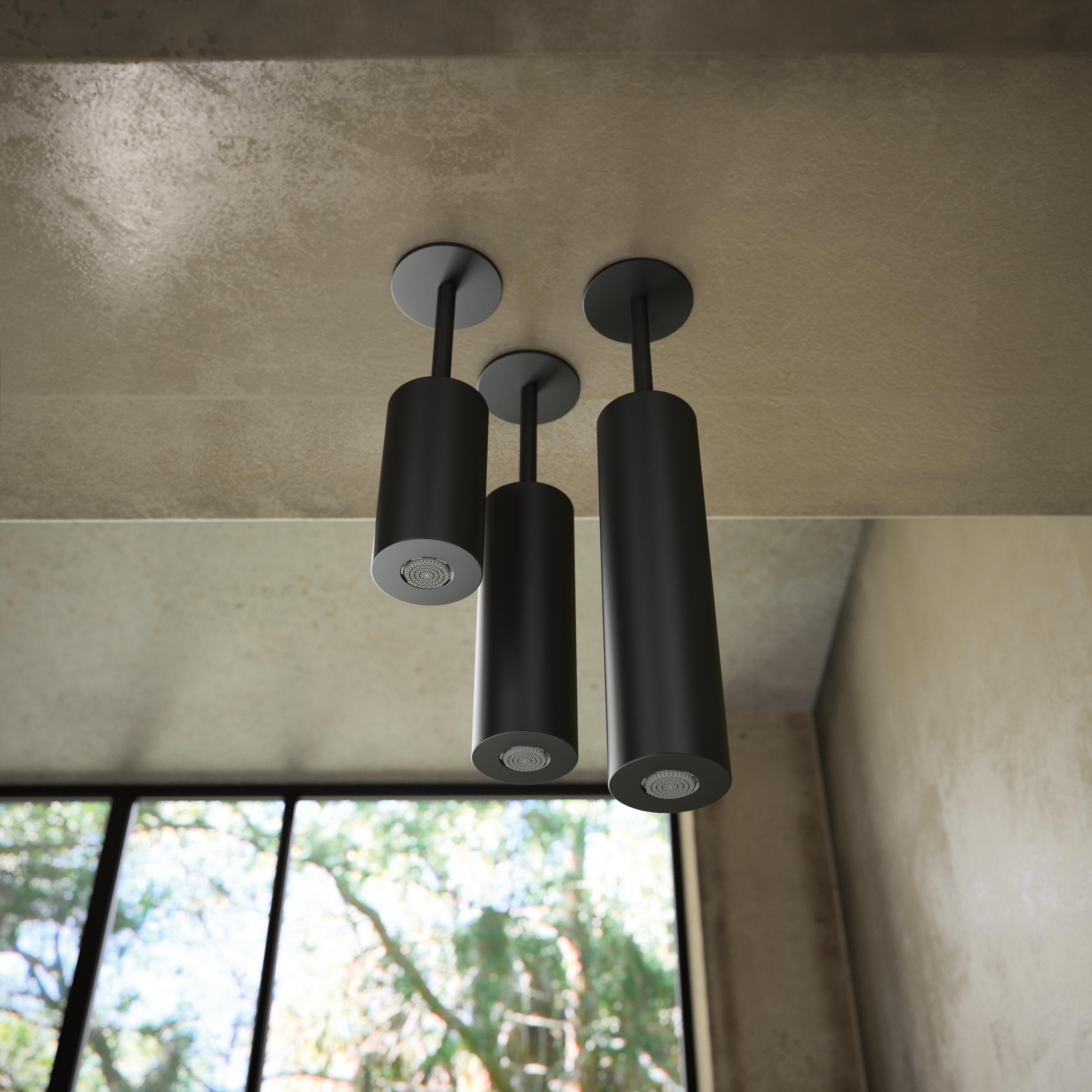 El rociador de techo cilíndrico Tríada ofrece una experiencia de ducha única con un efecto lluvia revitalizante. Al instalar los tres rociadores simultáneamente se crea un efecto dinámico y una caída de agua tipo Champagne, elevando la experiencia de la ducha.