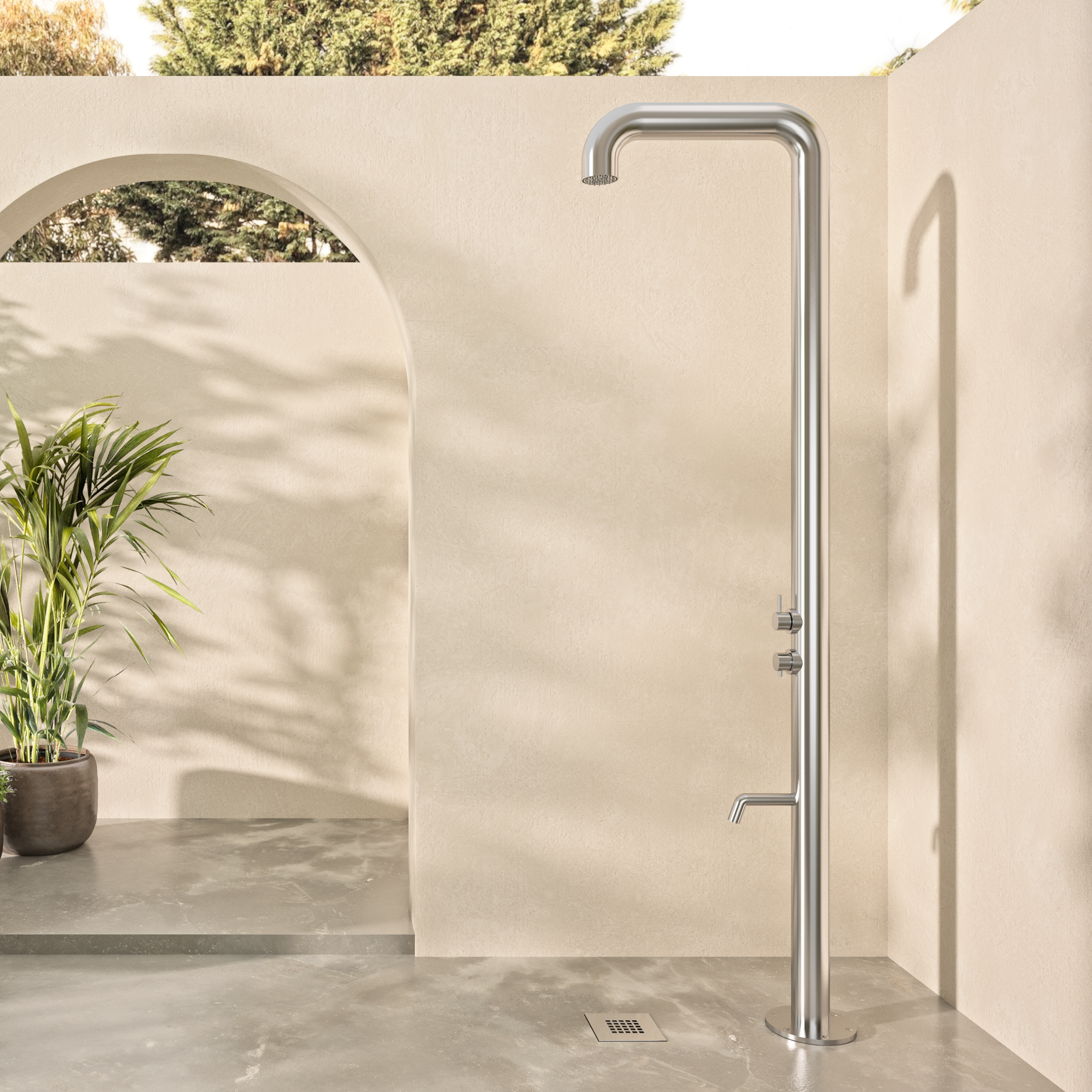 La columna de ducha exterior Hércules es la encarnación de la elegancia y el confort para el jardín o área de piscina. Su diseño robusto y contemporáneo no solo complementa la estética del espacio, sino que también promete una experiencia de ducha refrescante y revitalizante.