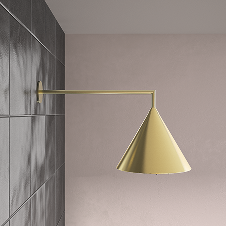 Con su innovador rociador cónico, una fusión de estilo sofisticado y ergonomía excepcional. Este rociador de Ø200 mm, consta de un diseño único en forma de cono, acompañado de un brazo de pared, y está disponible en cuatro elegantes acabados: cromo, negro mate, cobre y oro cepillado.