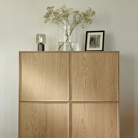 La serie CUADRO NATURA se define por su frentes realizados en chapa de madera natural, enmarcados con un perfil de madera maciza que les confiere relieve e identidad.