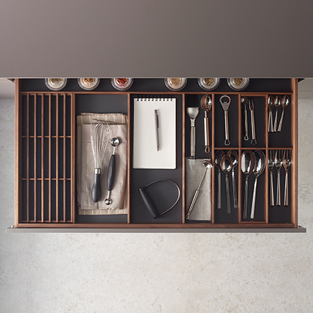 Los cajones extraíbles de las cocinas Santos cuentan con una base modular, sobre la que se integran accesorios exclusivos que permiten personalizarlos y optimizar su capacidad: cuberteros, cuchilleros, especieros, bandeja para cortar el pan, bandejas multifunción, tablas de corte, recipientes, manteles, paños y los más variados útiles de cocina. Estos accesorios son extraíbles e intercambiables, para facilitar la limpieza y su disposición a gusto del usuario.