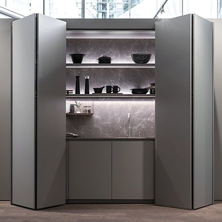 Los sistemas de puertas escamoteables dobles permiten ocultar zonas auxiliares o estancias anexas a la cocina. Por su diseño, limpio y sencillo, estos elementos se integran con naturalidad en cualquier interiorismo, favoreciendo la creación de ambientes más armónicos y diáfanos.