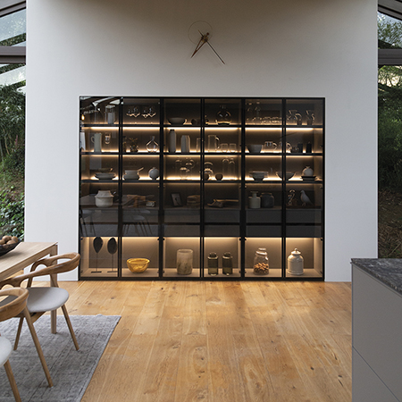 Las vitrinas son una opción muy práctica para guardar y exponer piezas delicadas. Su imponente diseño, con marco de aluminio negro y frentes de vidrio ahumado, les confiere un importante peso estético y decorativo. Dentro, un sistema de iluminación lateral las transforma en una fuente de luz ambiental indirecta. Se trata de un discreto perfil que recorre verticalmente los costados de los módulos, proyectando luz homogénea y uniforme hacia las traseras. Su diseño con difusor impide que la luz incida directamente en los ojos de los usuarios, evitando molestos deslumbramientos. Los estantes de vidrio, distribuidos de manera uniforme, facilitan que la iluminación se extienda por todo el interior, acentuando el carácter diáfano del conjunto.