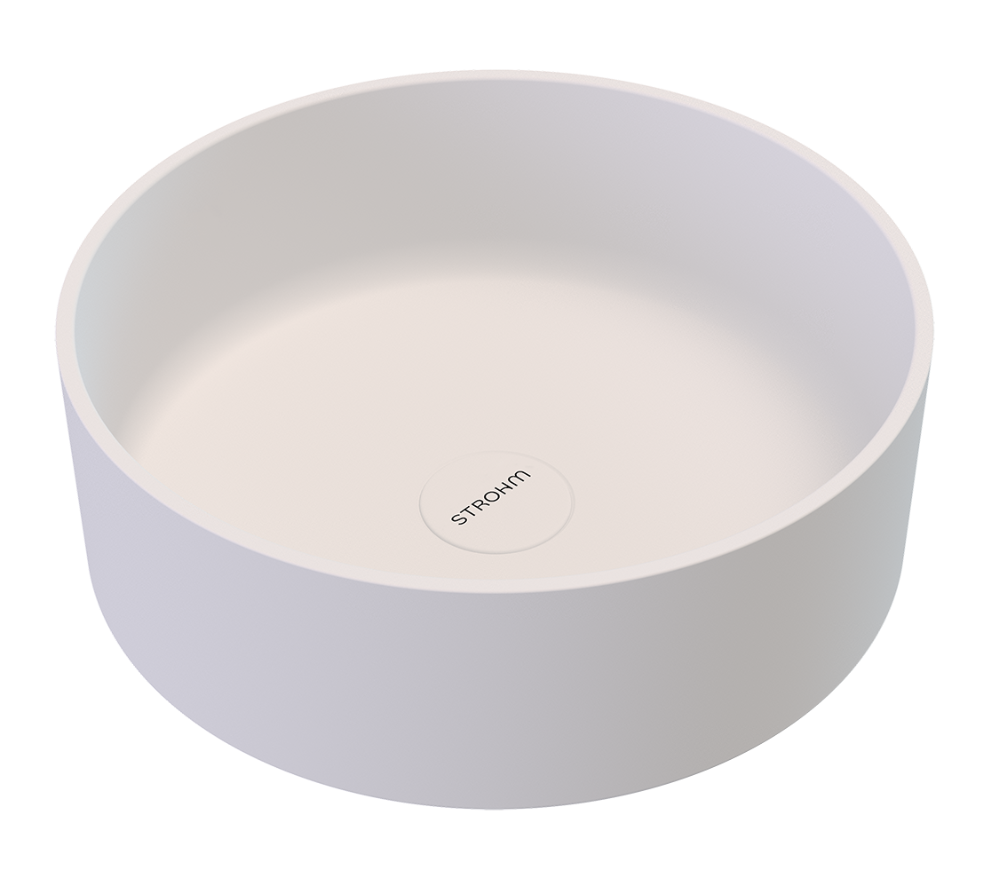 Lavabos sobre encimera de carga mineral (mineral solid), que imprime suavidad y elegancia a la pieza. Estéticos y a juego con la forma redonda que prima en la colección Origehm. Acompañados de grifería tamaño XL.