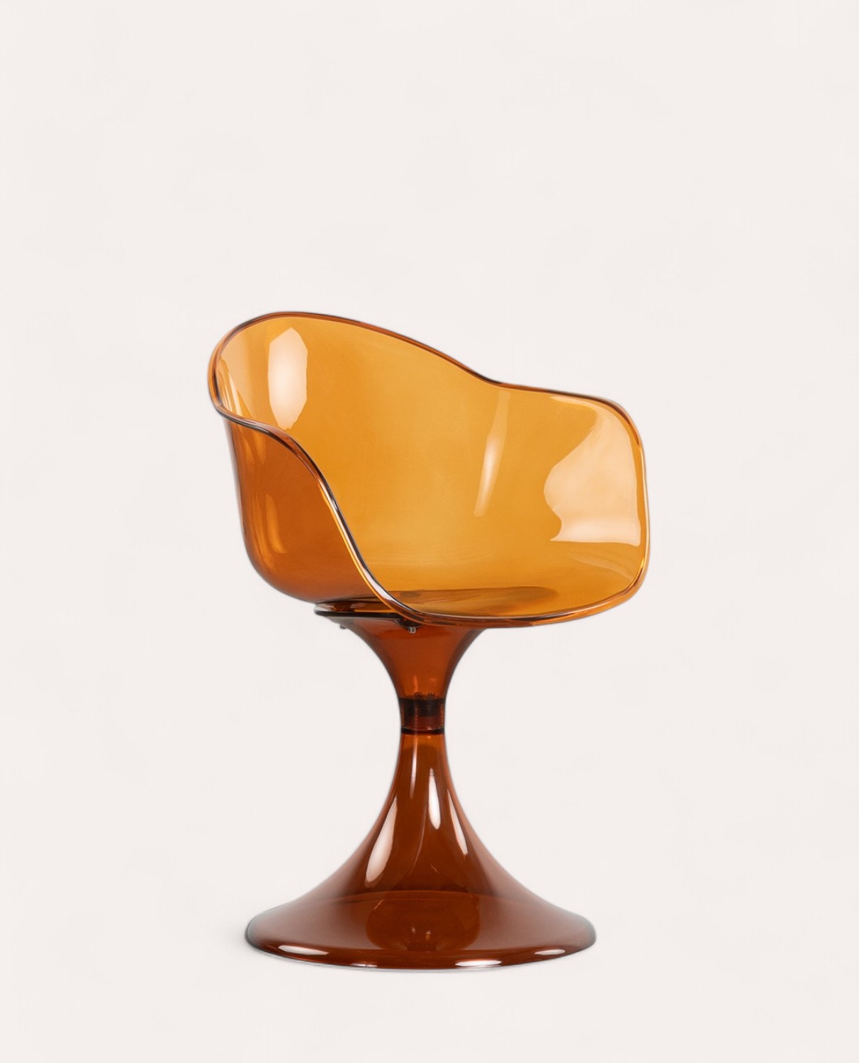 La silla de comedor de policarbonato Pinhes con acabado translúcido, destaca por su forma curva y reposabrazos integrados en la estructura del asiento y respaldo, además de su pata central que le otorga un toque distintivo. Su diseño la convierte en una opción ideal para comedores, espacios de trabajo o áreas de descanso donde se busca combinar comodidad y estilo.