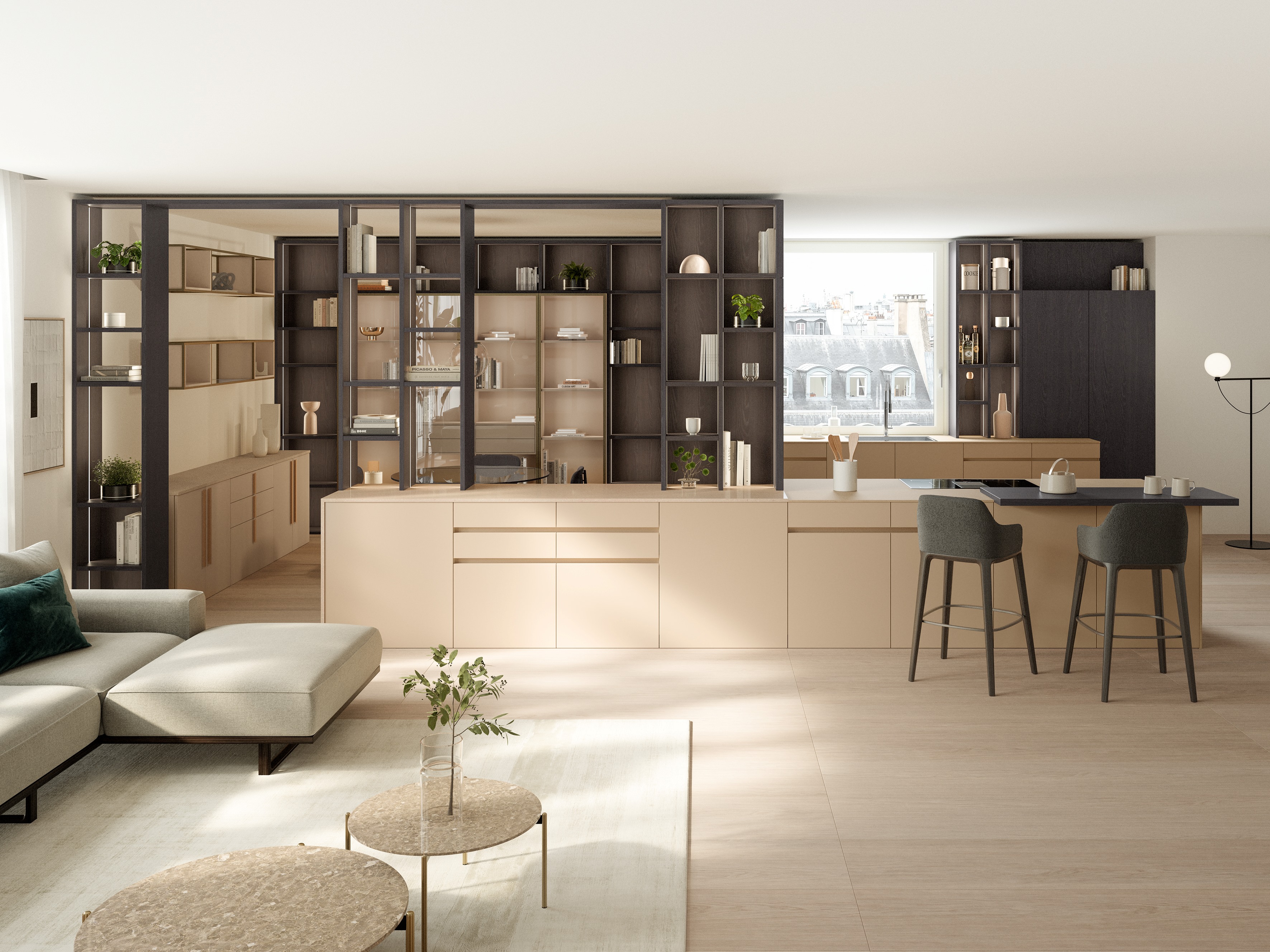 Iconica destaca por su gran capacidad de almacenaje y unos estándares de diseño orientados a hacer de la cocina un lugar aún más acogedor y funcional. La maqueta propone una nueva visión estética y la ruptura de esquemas compositivos clásicos a través de la ausencia del perfil superior en las bases y la utilización de un sistema de alineación que va más allá de la forma tradicional de pensar el proyecto; ya no es sólo una alineación horizontal precisa y limpia sino líneas que fragmentan y crean un juego visual más complejo. Una nueva representación, posible gracias al uso del perfil de apertura solo a un nivel intermedio que ofrece una visión perfecta entre la encimera y el frente y por los cajones que, dispuestos de forma escalonada o compuestos con el uso de diferentes materiales y acabados, crean nuevos volúmenes y generan ilimitadas variaciones estéticas haciendo de Iconica un modelo visualmente diferente respecto a los anteriores. Maderas, lacados brillantes y mates, acabados en metal líquido, laminados Fenix® y decorativos, lacados mates Soft, vidrios lacados brillantes y mates, madera canneté y vidrio canneté mate, conviven combinándose entre sí para ofrecer una amplia gama de elecciones y satisfacer las ganas de vestir ambientes insólitos. Diferentes volúmenes con diferentes funciones. Las columnas de paso están equipadas con una puerta corredera que crean una ruptura y al mismo tiempo combinan ambientes con diferentes funciones, llegando a la concepción de un espacio más, una estancia más. El uso de diferentes materiales se convierte en una base esencial para definir espacios. La investigación sobre complementos y acabados ha definido el tema de la búsqueda de la uniformidad entre los colores de los elementos y el de la encimera. La parte superior de cerámica combina con el color de la puerta y, por lo tanto, se convierte en una extensión de ella. En la estancia separada, el sistema Gravity se convierte en un mueble de pared y recibe bandejas en forma de U de 15 mm de espesor. Las vitrinas Sunset están equipadas con cajones interiores.