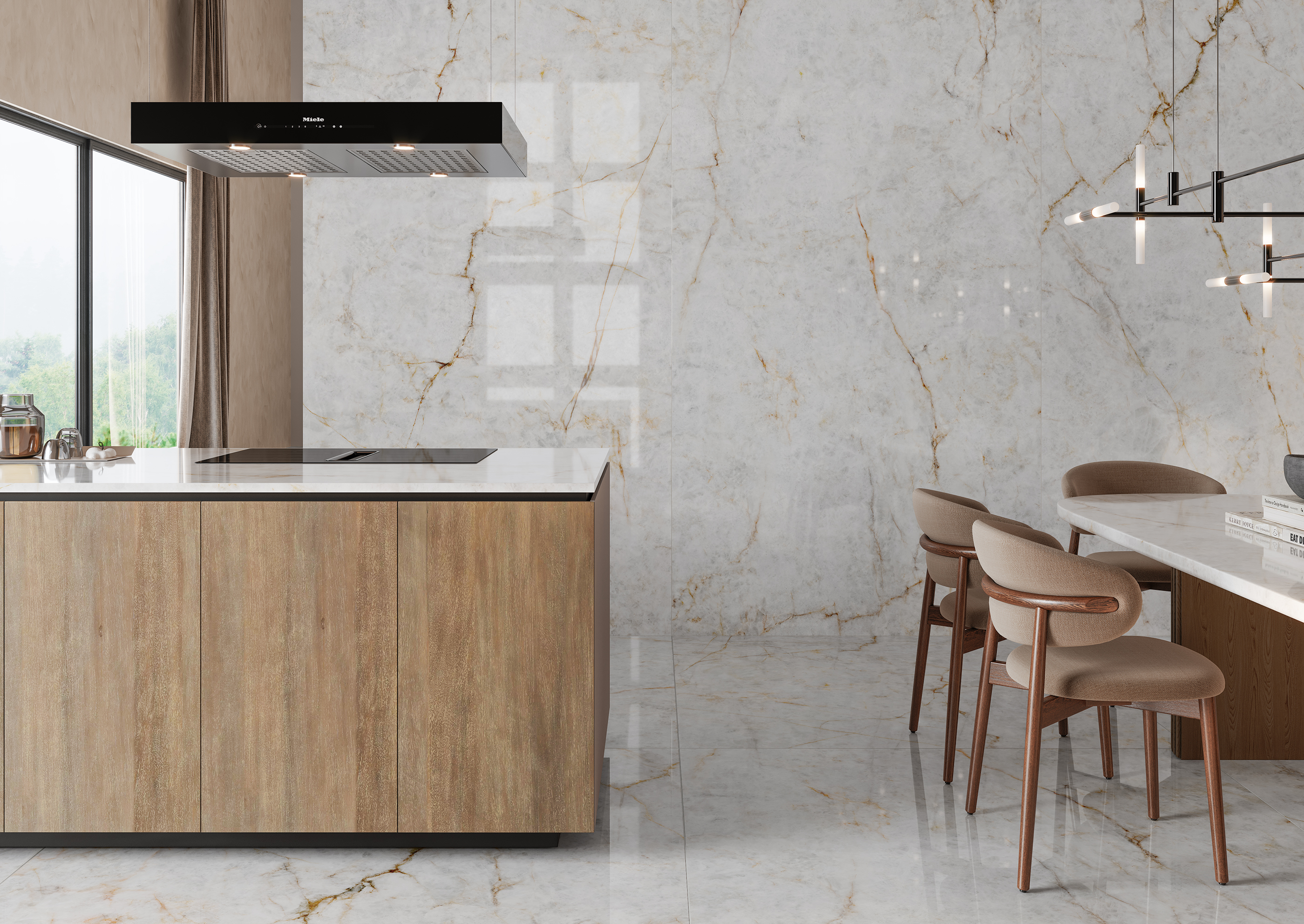 Crystal es la colección de Venux inspirada en la exquisita belleza del mármol Cristallo, conocido por su impresionante claridad y sus delicadas vetas. Se caracteriza por su fondo blanco translúcido, atravesado por vetas doradas y grises, que generan un efecto visual impresionante. La claridad y luminosidad de esta pieza la hace única y especial, pareciendo que la luz se cuele a través de la piedra, lo que aporta un toque distintivo al espacio creando ambientes de singular belleza.