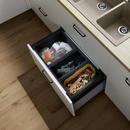 El BLANCO FLEXON II ofrece una solución flexible para la gestión de residuos, diseñada para armarios con cajón de 30 a 90 cm de ancho. Con un diseño moderno y tonos armoniosos, se adapta a cocinas contemporáneas. Su instalación es rápida y sencilla, requiriendo solo un armario con frontal y barras extraíbles.